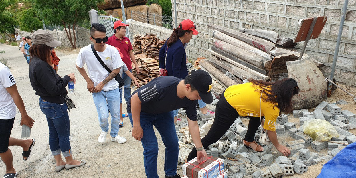 Các thành viên đoàn cùng nhau mang gạch, cát từ chân núi lên trên để góp chút công đức xây chùa trong tháng Vu Lan.