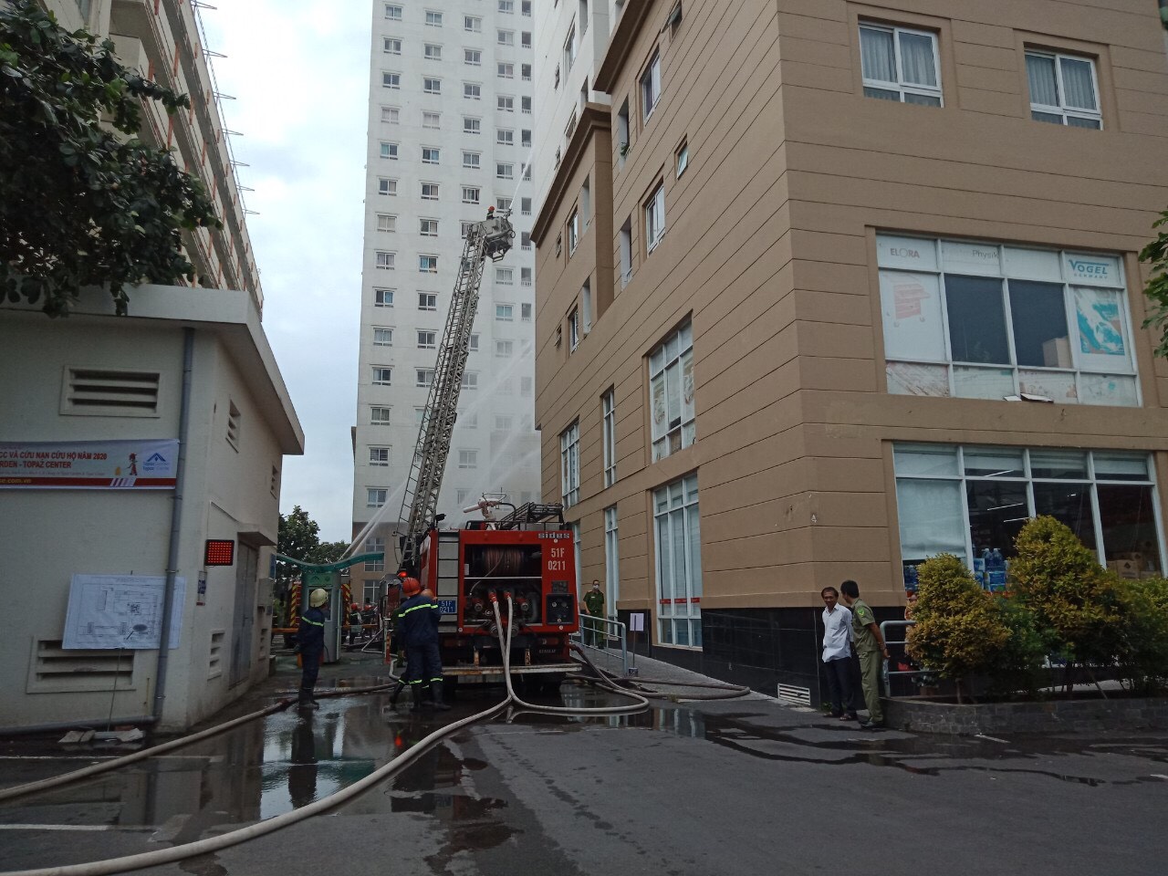 Đơn vị chữa cháy quận Tân Phú và thành phố HCM đã huy động lực lượng chữa cháy chuyên nghiệp với 5 xe chữa cháy chuyên dụng (có xe thang chữa cháy nhà cao tầng) cùng 1 xe cứu thương của Bệnh viện quận Tân Phú đã có mặt tại chung cư Topaz Garden - Topaz Center trong vòng 5-10 phút khi phát hiện có cháy trên tầng cao.