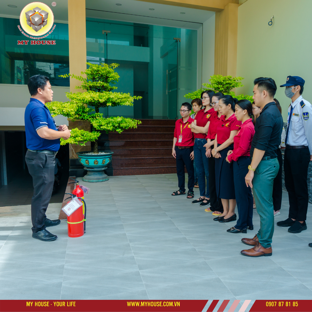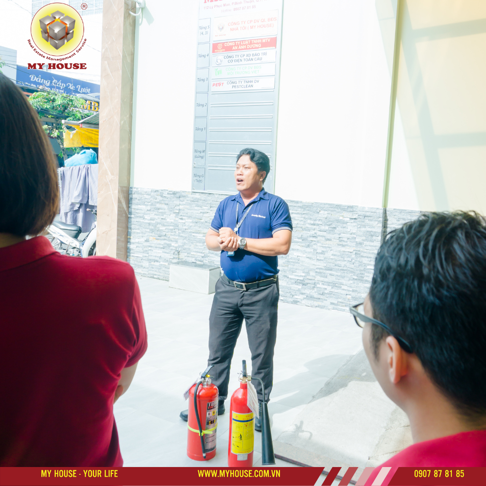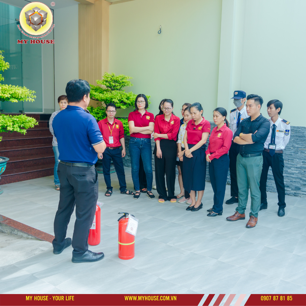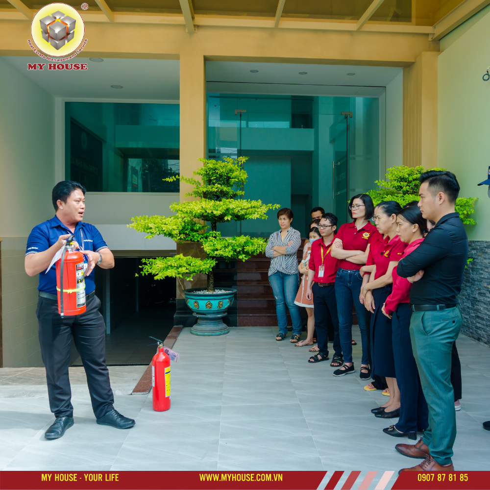 Trong buổi tập huấn, nhân viên tại My House được hướng dẫn cách sử dụng bình chữa cháy, các lối thoát hiểm trong tòa nhà và những cách xử lý khi hỏa hoạn diễn ra.