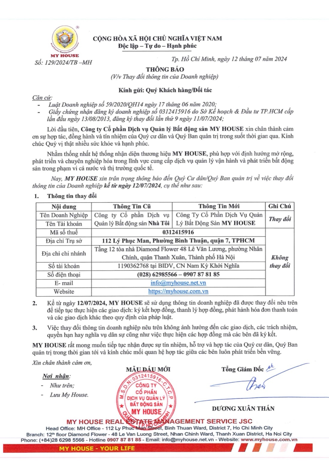 Nhằm khẳng định hơn nữa vị thế của thương hiệu, đồng thời thực hiện mở rộng, phát triển và nâng cao dịch vụ quản lý vận hành, My House xin trân trọng thông báo về việc thay đổi tên công ty kể từ ngày 12/07/2024