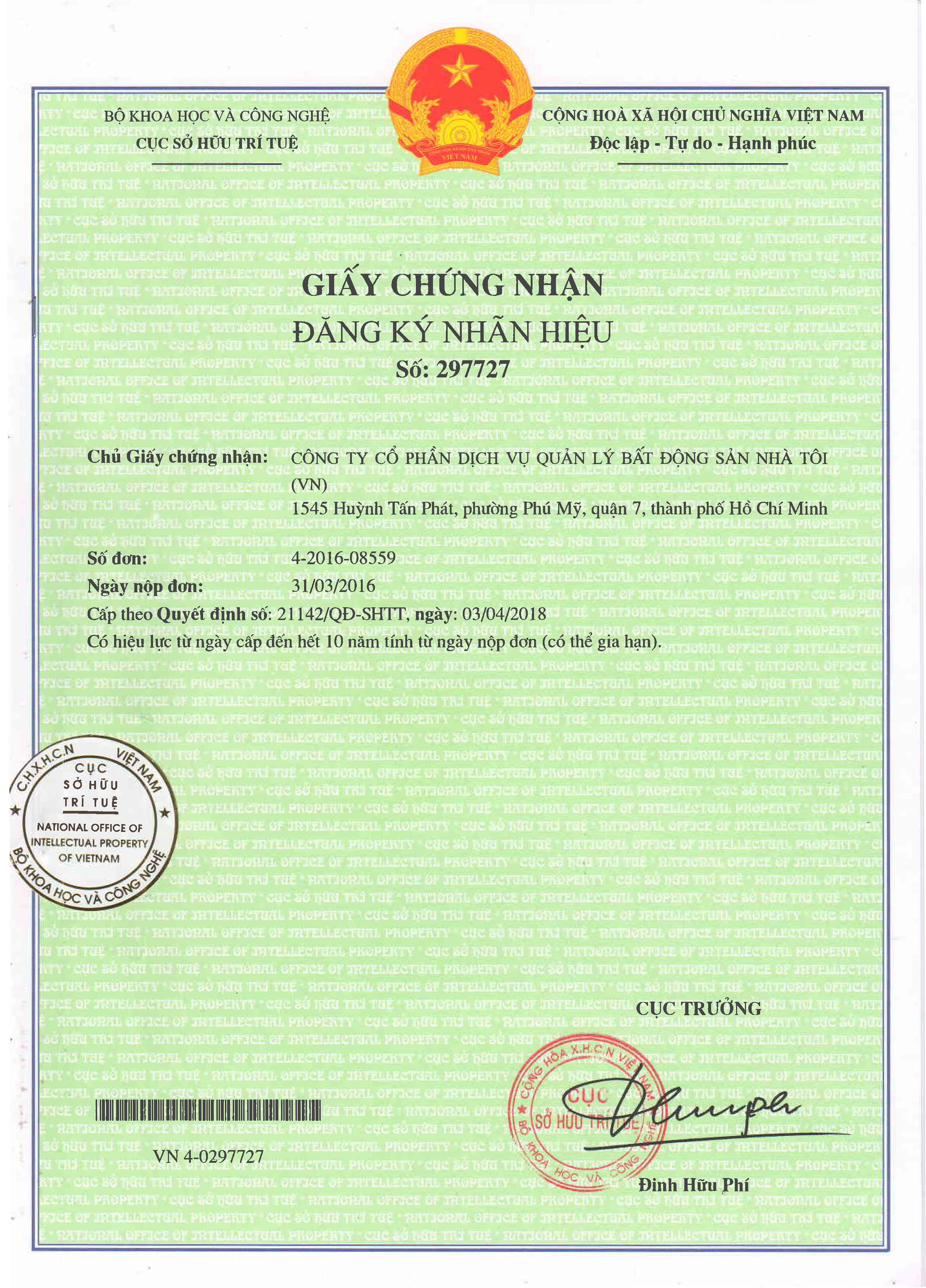 Dưới đây là nội dung Giấy chứng nhận Đăng ký Nhãn hiệu số 297727.