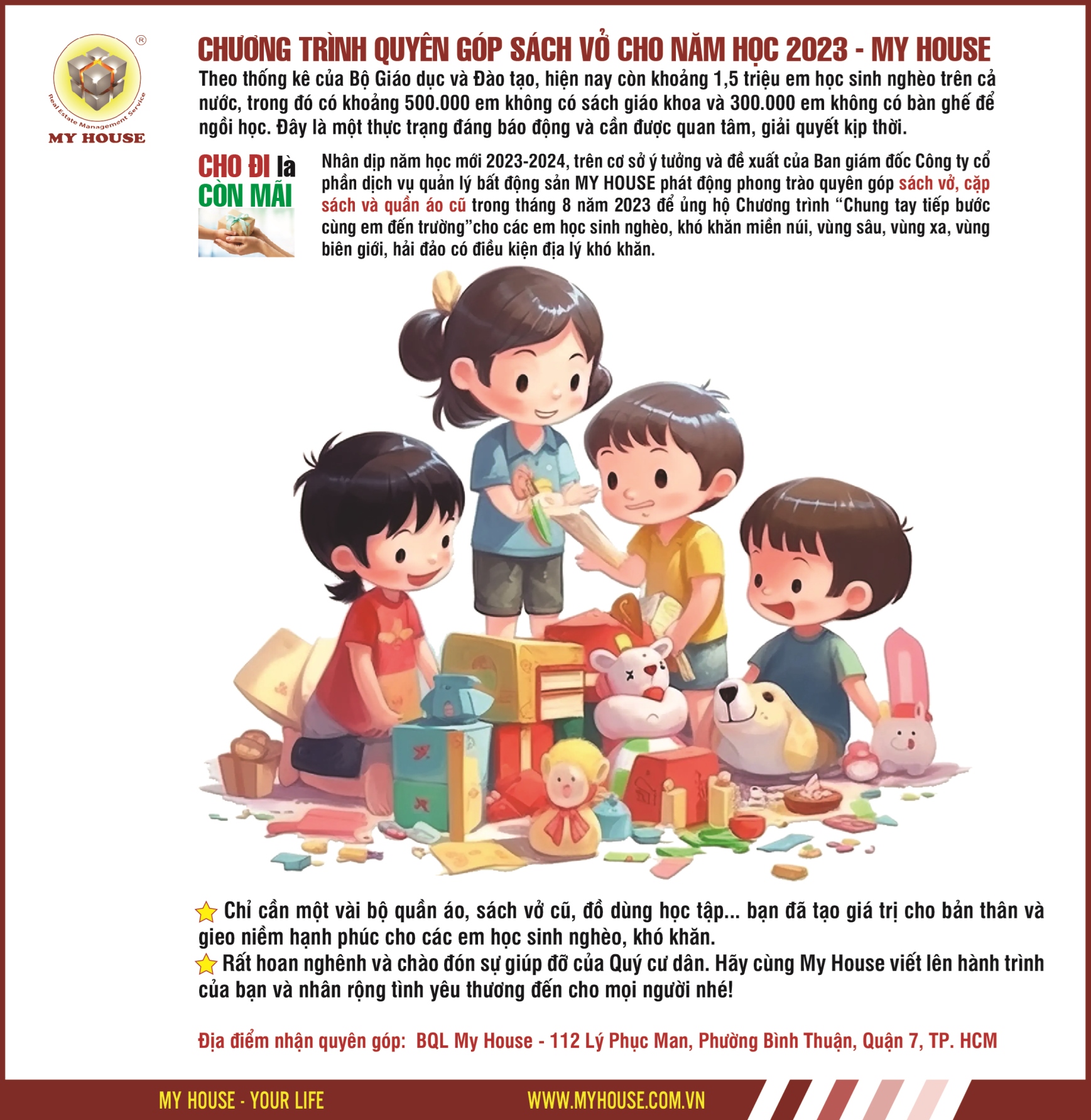 Đây cũng là một cách để thể hiện tinh thần đoàn kết, chia sẻ và trách nhiệm của cộng đồng đối với giáo dục. Hãy cùng CÔNG TY CỔ PHẦN DỊCH VỤ QUẢN LÝ BẤT ĐỘNG SẢN NHÀ TÔI - MY HOUSE viết nên câu chuyện “ sẻ chia những yêu thương ” để lan tỏa sự ấm áp đến những em nhỏ có hoàn cảnh khó khăn hơn .