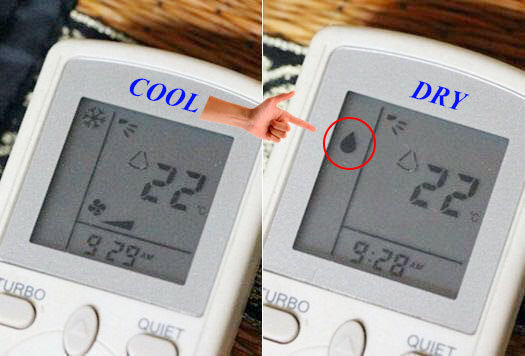 - Sử dụng tính năng DRY (biểu tượng hình giọt nước trên điều khiển máy lạnh) vào những ngày khô nắng và có mưa (thời tiết nóng ẩm, oi bức) hoặc vào ban đêm.