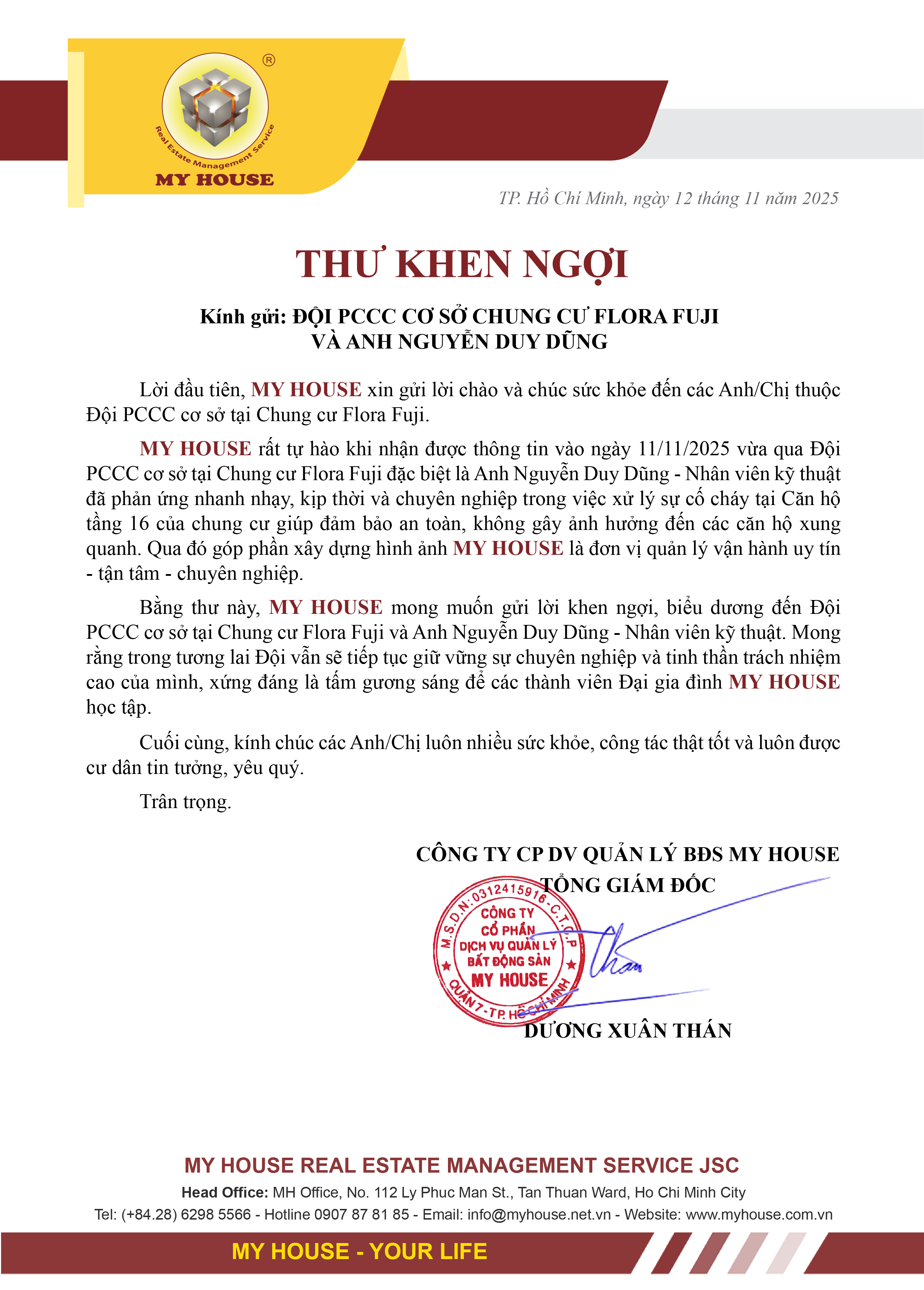 Ngày 11/11/2025, tại chung cư Flora Fuji, sự cố cháy nhỏ đã được Đội PCCC cơ sở MY HOUSE xử lý nhanh chóng và chuyên nghiệp. Ban Lãnh đạo MY HOUSE đã gửi thư khen và quà tri ân, lan tỏa tinh thần tận tâm và trách nhiệm trong toàn hệ thống.